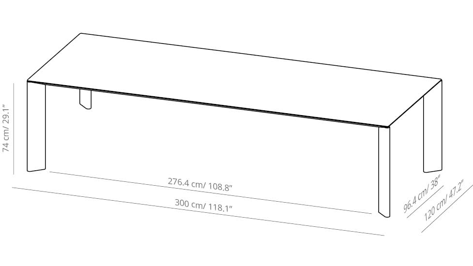 Mesa de madera maciza de roble. Tiene unas medidas de 300x120cm y está disponible en diferentes acabados para adaptarse a cualquier espacio. Puede incluir un sistema de electrificación inteligente, que oculta los cables a través de una de sus patas, sin juntas o tornillos visibles.
