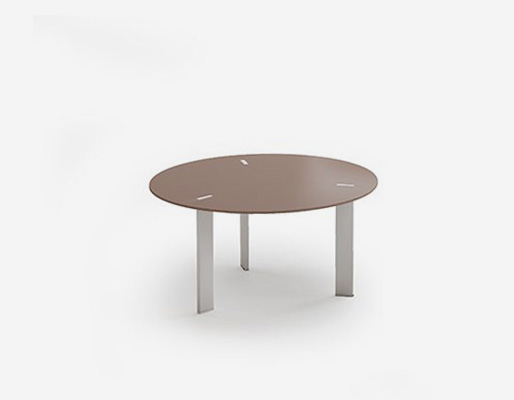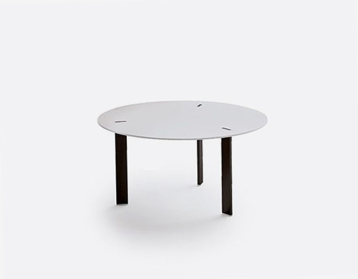The steel legs are mortised through the top, creating a singular look. The table top is made of lacquered MDF or oak veneer in the finishes offered by Viccarbe and lacquered steel legs with transparent tips.